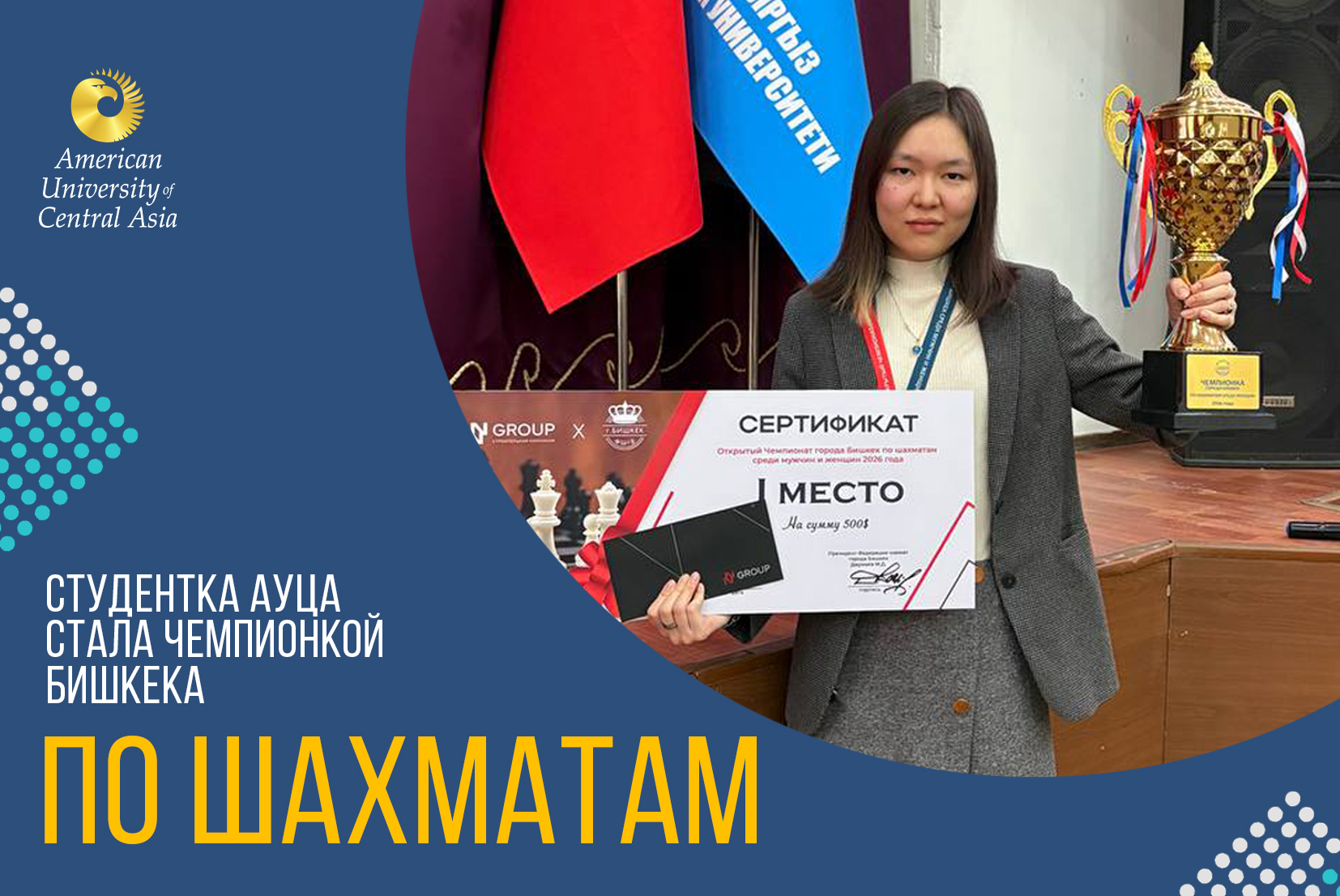 Студентка первого курса факультета экономики АУЦАСоветбекова Нурай одержала победу в Открытом чемпионате города Бишкек по шахматам 2026 года, подтвердив высокий уровень подготовки и лидерства среди молодых спортсменов Кыргызстана.